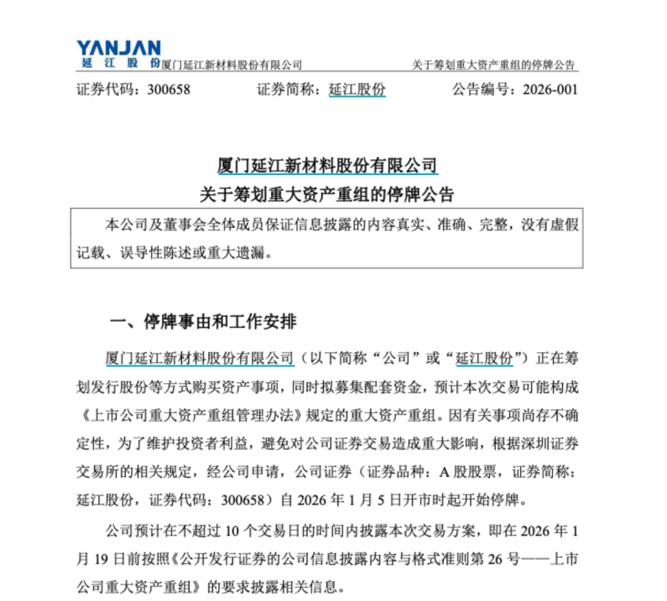 1月4日,延江股份发布公告称,公司正在筹划以发行股份等方式购买资产事项,同时拟募集配套资金,本次交易可能构成重大资产重组。