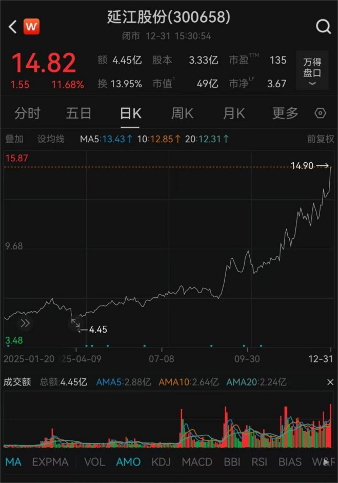 截至2025年12月31日收盘,延江股份每股报14.82元,全年涨幅达186.1%,最新市值为49亿元。