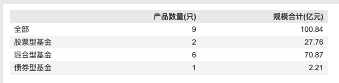 其中,主动权益基金(股票型+混合型)占主导地位,共有8只,合计规模为98.63亿元。总经理梁跃军名下管理产品规模占比约为六成。