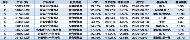 Wind数据显示,截至2025年二季度末,朱雀基金的公募管理规模为100.84亿元,自2023年7月以来尚未有新产品成立。