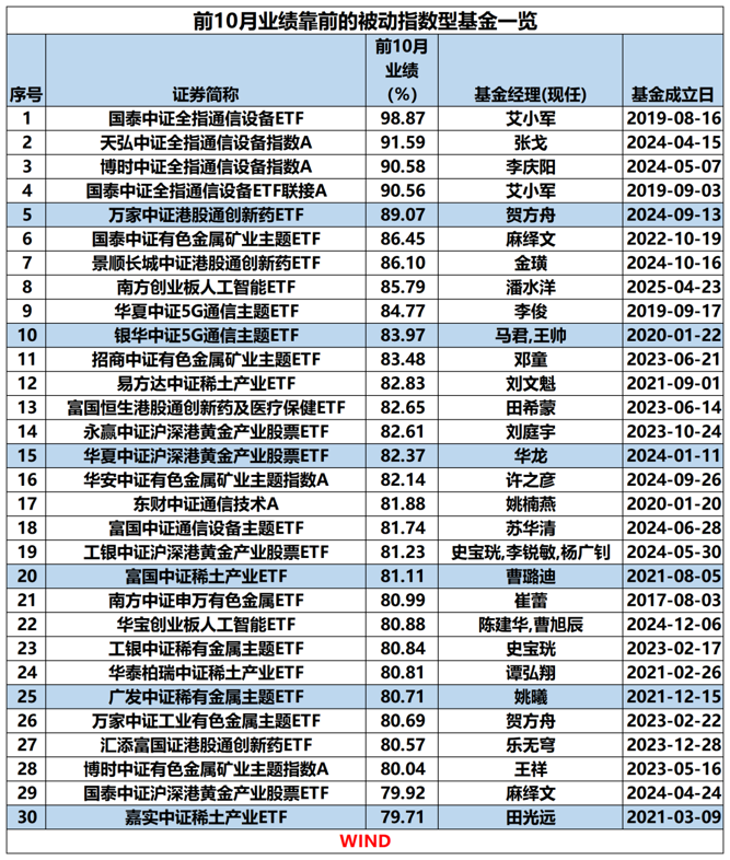 今年前10月,通信设备、创新药、有色金属等板块轮番演绎,带动一大批指数基金的表现。从具体指数基金表现来看,通信设备主题指数基金成为前10月最大赢家。