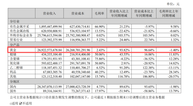 以2025年上半年为例,湖南黄金共生产黄金37344千克,同比增长37.97%,但黄金自产1722千克,同比减少12.2%。黄金产品业务毛利率仅为2.43%,同比减少1.40个百分点,主要原因是外购非标金业务比重增加。
