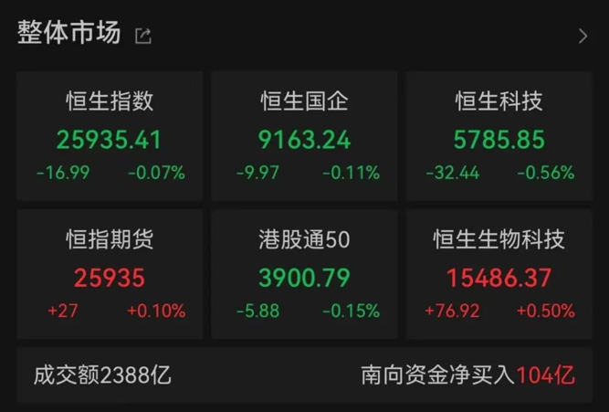 截至收盘,恒生指数收跌0.07%,报25935.41点;恒生科技指数收跌0.56%,报5785.85点;恒生国企指数收跌0.11%,报9163.24点。