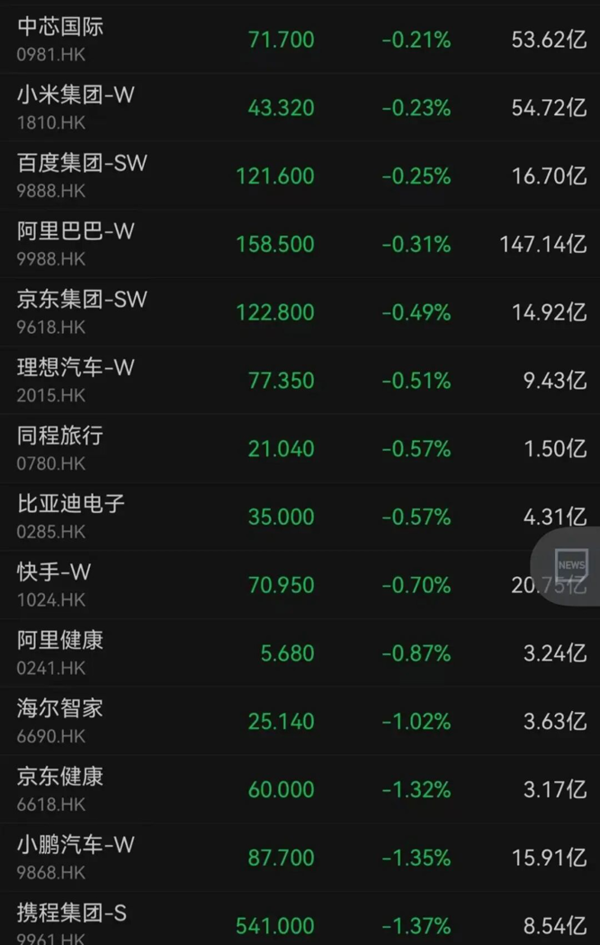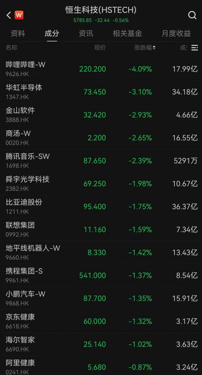 恒生科技指数盘中一度重挫近3%,收跌0.56%。截至收盘,哔哩哔哩下跌4.09%,华虹半导体下跌3.10%,商汤、腾讯、金山软件跌幅超过2%;小米、阿里巴巴、百度、京东分别收跌0.23%、0.25%、0.31%、0.49%,跌幅相对较小。
