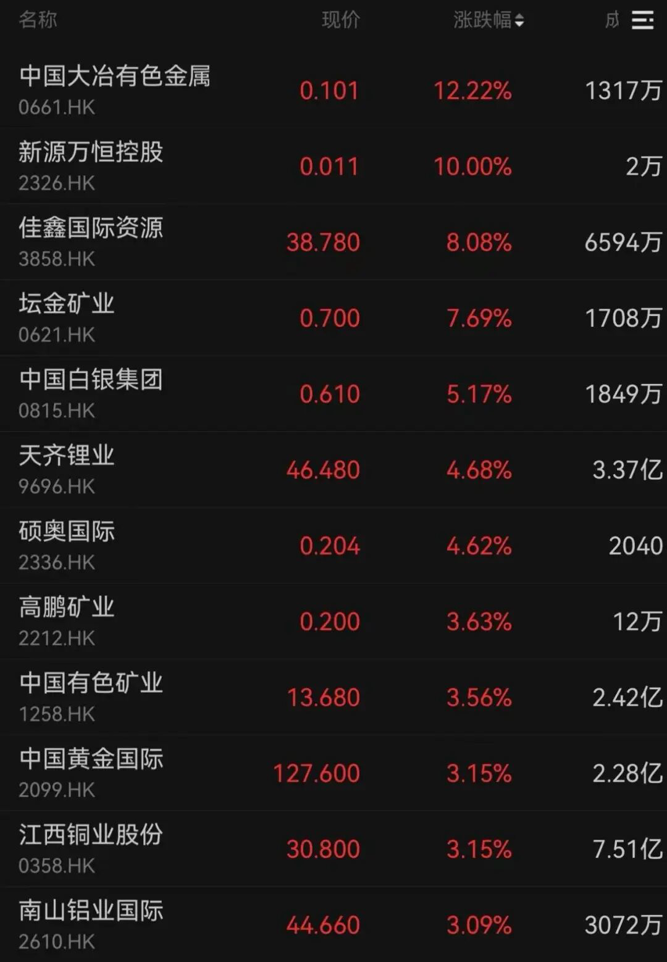 中国大冶有色金属、中国白银集团、天齐锂业、中国有色矿业分别上涨12.22%、5.17%、4.68%、3.56%。