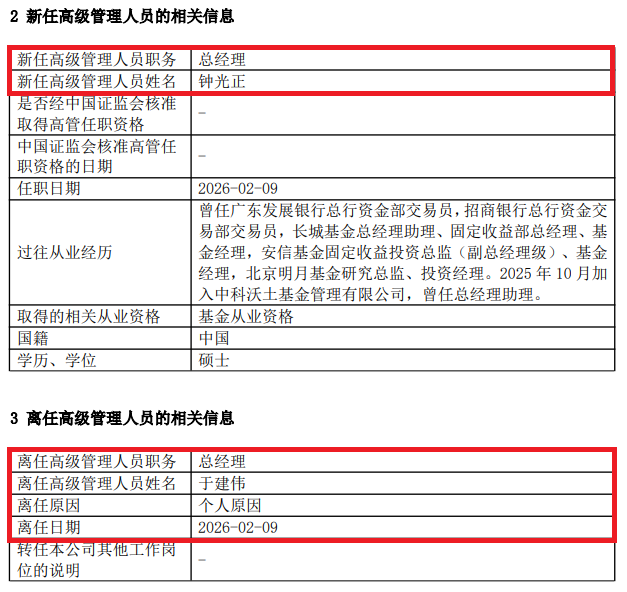 2月10日,中科沃土基金公告称,总经理于建伟因个人原因离职,总经理助理钟光正升任公司总经理。