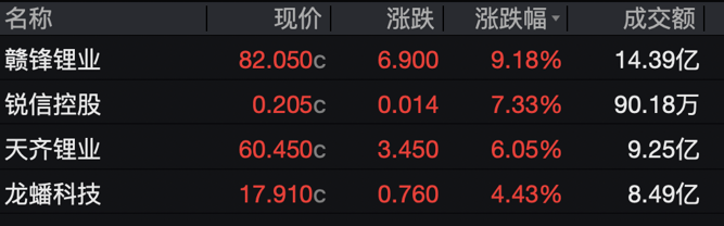 赣锋锂业涨超9%,天齐锂业涨超6%。碳酸锂期货主力合约盘中一度涨近2%,至179180元/吨。