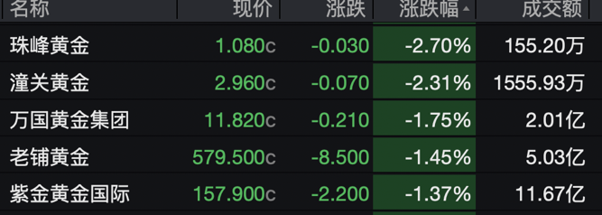 黄金股今日继续下跌。珠峰黄金、潼关黄金跌超2%,万国黄金集团、紫金黄金国际跌超1%。