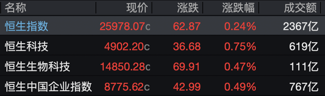 截至收盘,恒生指数上涨0.24%,恒生国企指数涨0.49%,恒生科技指数涨0.75%。