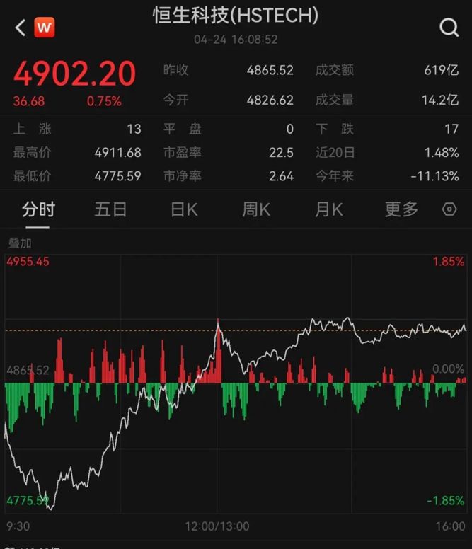 4月24日,港股三大指数低开高走。半导体等科技股强势拉升,带动指数回升。