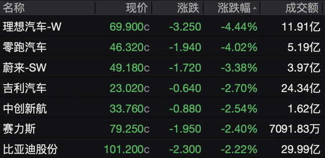 新能源车跌幅较为明显。理想汽车、零跑汽车跌超4%,蔚来汽车跌超3%,吉利汽车、赛力斯等均收跌。