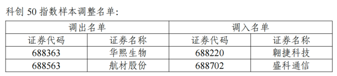 科创50指数本次更换2只样本,调入翱捷科技、盛科通信,调出华熙生物、航材股份。
