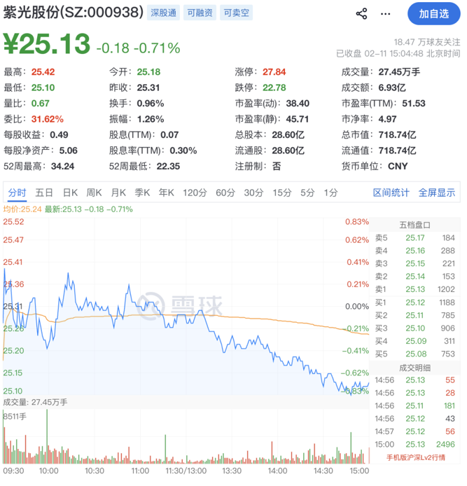 截至2月11日收盘,紫光股份股价报25.13元/股,总市值为719亿元。