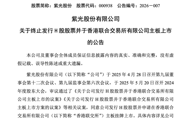 2月11日,紫光股份发布公告称,公司终止发行H股股票并于香港联合交易所有限公司主板上市。