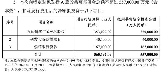 本次发行股票数量不超过4.3亿股(含本数),募集资金扣除发行费用后的净额拟投资于收购新华三6.98%股权、研发设备购置项目及偿还银行贷款。