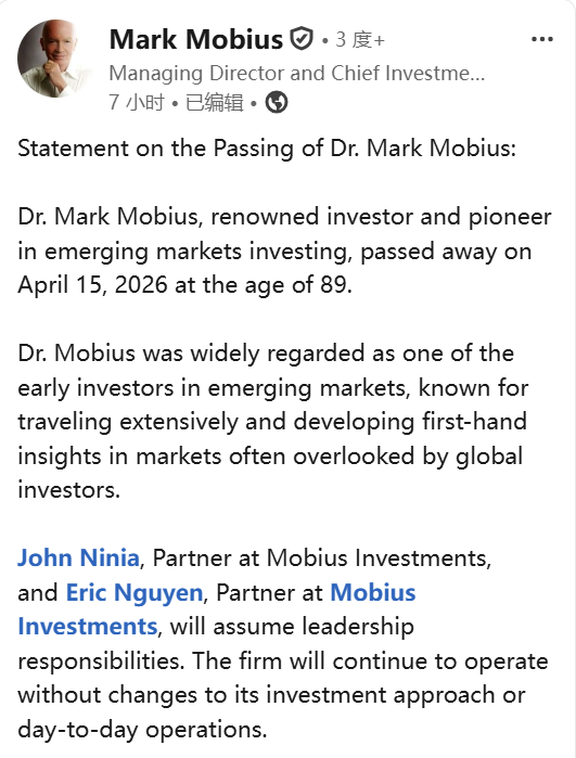 【导读】知名投资者麦朴思去世,享年89岁