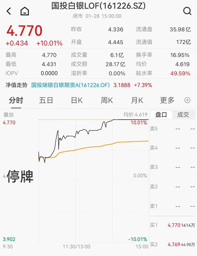 1月28日午后,国投白银LOF涨停。截至1月28日收盘,二级市场报4.77元,单日涨幅为10%,成交额逾28亿元,溢价率超49.59%。