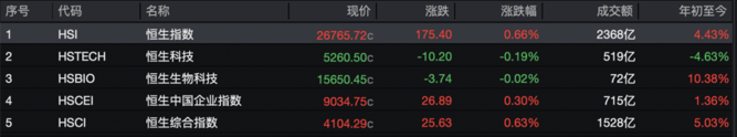 2月25日,港股三大指数涨跌不一。截至收盘,恒生指数涨0.66%,报26765.72点;恒生科技指数跌0.19%,报5260.50点;恒生国企指数涨0.30%,报9034.75点。全日大市成交额为2368亿港元,南向资金净卖出40.57亿港元。