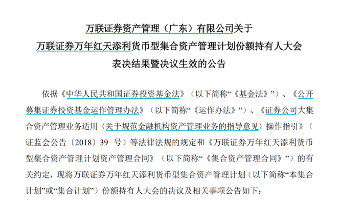 万联证券在公告中表示,表决生效后,对于集合计划份额持有人持有集合计划份额,管理人于11月28日至12月5日设置6个交易日的赎回选择期。赎回选择期期间,可供集合计划份额持有人做出赎回选择。赎回选择期间未赎回的持有人,其持有的份额将默认结转为平安天添利货币市场基金的基金份额。