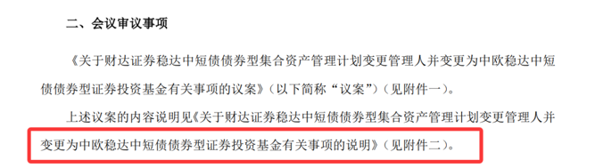 此外,财达证券旗下稳达中短债债券型集合资产管理计划、稳达三个月滚动持有债券型集合资产管理计划将转交给中欧基金管理,持有人须在12月7日前通过通讯方式完成投票。