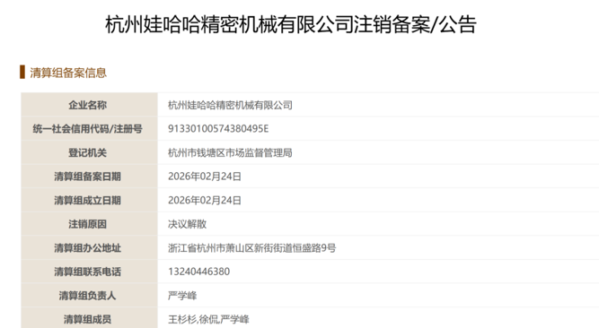 近日,国家企业信用信息公示系统显示了,杭州娃哈哈精密机械有限公司发布了解散公示,并正式进入清算程序。