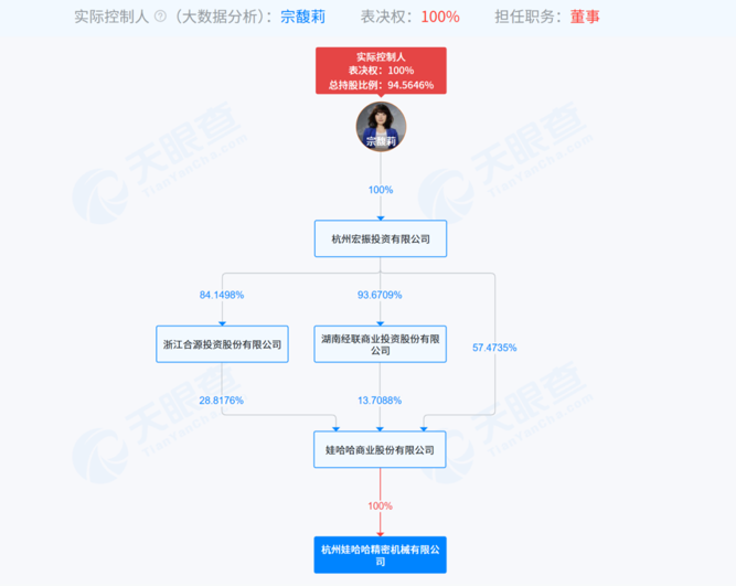 天眼查工商信息显示,娃哈哈精密机械公司由娃哈哈商业股份有限公司全资控股,而后者的实控人是宗馥莉。因此娃哈哈精密机械公司的实际控制人是宗馥莉。