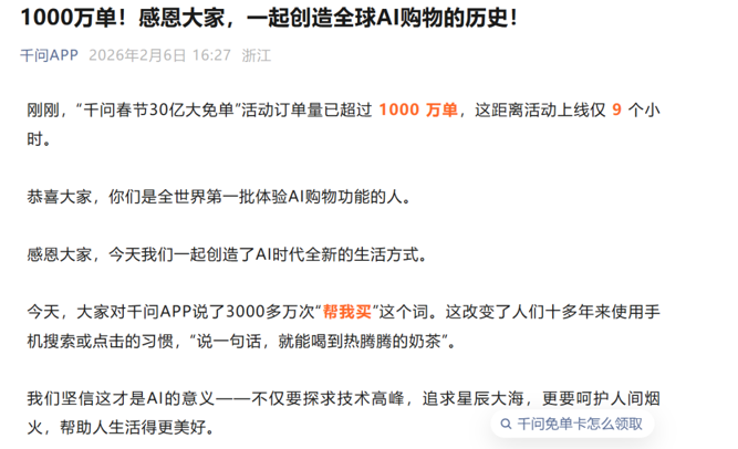 2月6日下午,千问App在官微宣布:刚刚,“千问春节30亿大免单”活动订单量已超过1000万单,这距离活动上线仅9个小时。