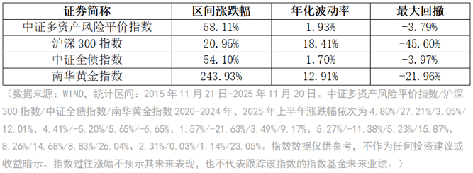 以中证多资产风险平价指数为例,该指数是由A股、债券、黄金三类资产构成的多资产指数。近10年中证多资产风险平价指数累计上涨58.11%,对应的年化波动率、最大回撤分别为1.93%、-3.79%,对比同期沪深300指数、中证全债指数以及南华黄金指数,呈现更优的风险收益比。