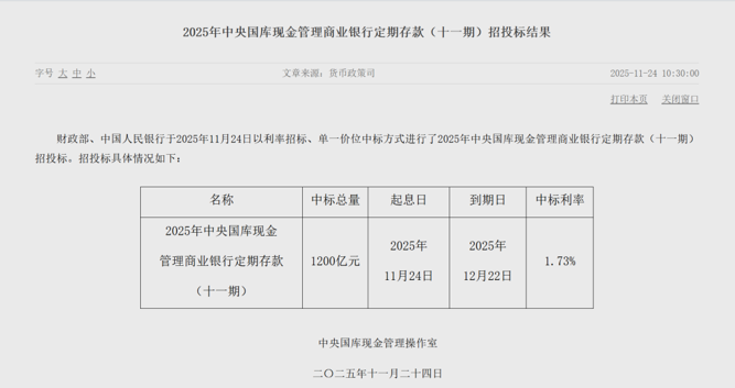 财政部、中国人民银行于2025年11月24日以利率招标、单一价位中标方式进行了2025年中央国库现金管理商业银行定期存款(十一期)招投标。该期中标总量为1200亿元;期限为1个月,起息日为2025年11月24日,到期日为2025年12月22日;中标利率为1.73%,较上次下降3个BP。