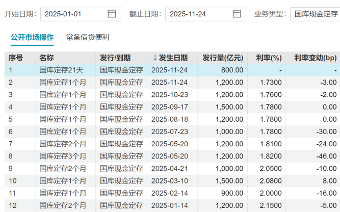 财政部、中国人民银行于2025年11月24日以利率招标、多重价位中标方式进行了2025年中央国库现金管理商业银行定期存款(十二期)招投标。该期中标总量为800亿元;期限为21天,起息日为2025年11月24日,到期日为2025年12月15日。