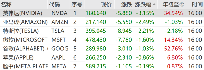 美国科技七巨头全线收跌,英伟达跌3.15%,亚马逊跌2.49%,特斯拉跌2.21%,领跌美国科技七巨头。