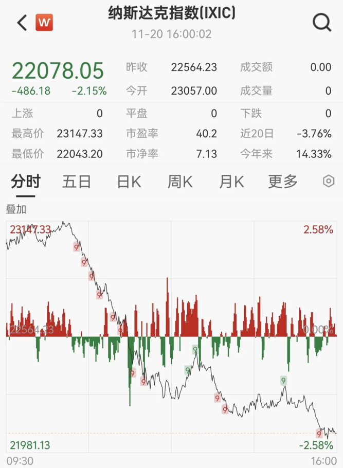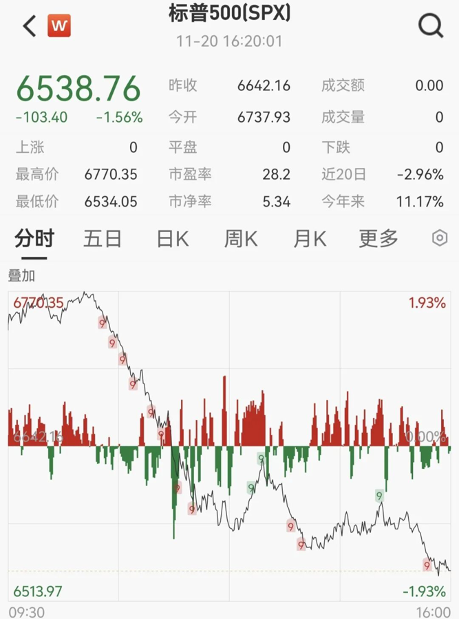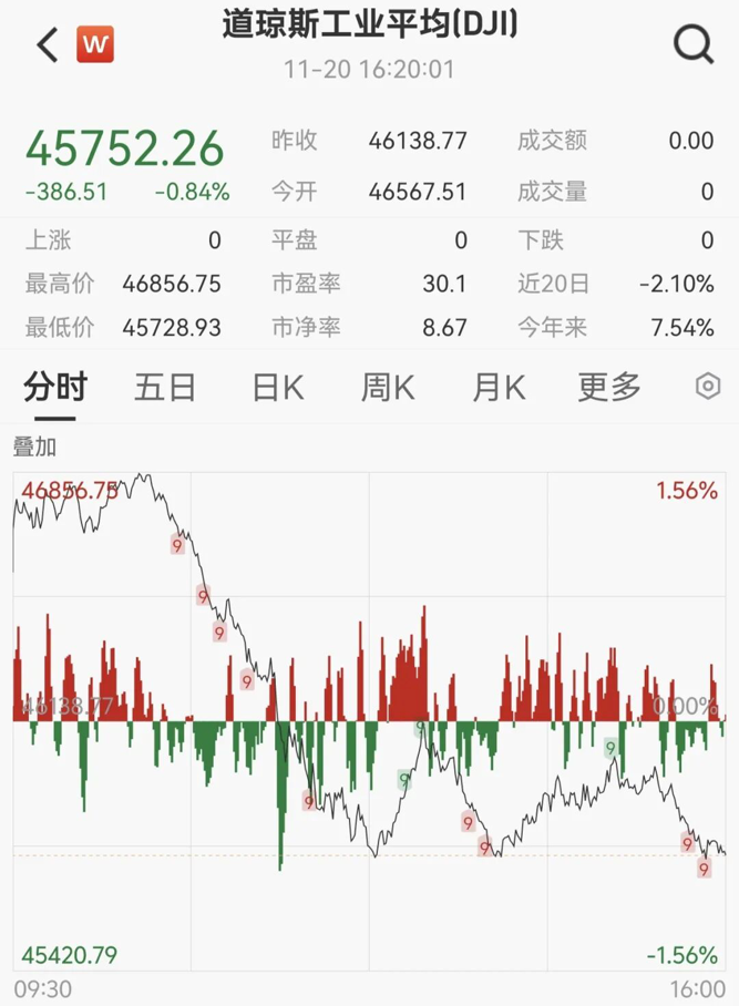 美国三大股指全线收跌,道指跌0.84%,报45752.26点;标普500指数跌1.56%,报6538.76点;纳指跌近500点,跌幅达2.15%,报22078.05点。