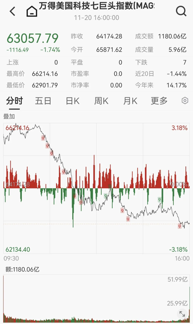 大型科技股集体下跌,万得美国科技七巨头指数下跌1.74%。