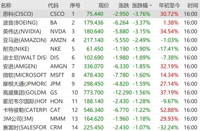 思科跌3.76%,波音跌3.37%,英伟达跌3.15%,领跌道指成份股。