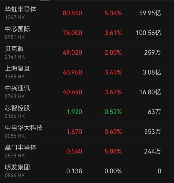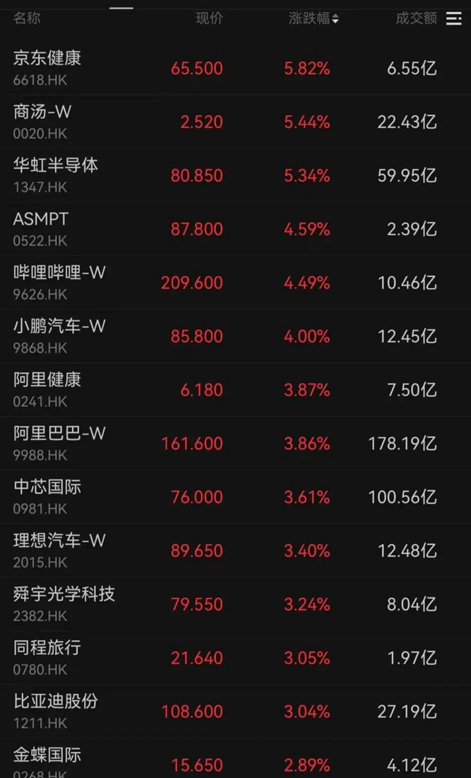 恒生科技指数成份股中,阿里巴巴成交额超百亿港元,收涨3.86%,哔哩哔哩收涨4.49%。阿里健康、京东健康分别上涨3.84%、5.82%。汽车股小鹏汽车、理想汽车分别上涨4.00%、3.40%。芯片板块华虹半导体、中芯国际、上海复旦分别上涨5.34%、3.61%、3.43%。