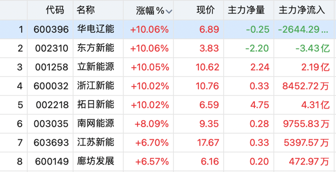 绿电概念股持续回升。华电辽能录得6连板,浙江新能、东方新能、立新能源、拓日新能均涨停,江苏新能、南网能源、廊坊发展等跟涨。
