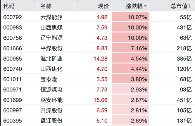 山西焦煤、辽宁能源、云煤能源均录得10cm涨停,千亿巨头陕西煤业、中煤能源股价纷纷飘红,平煤股份涨超7%,山西焦化、淮北矿业、宝泰隆、潞安环能等涨幅居前。