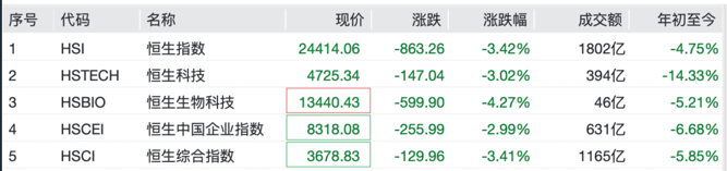 港股市场延续跌势。截至发稿,恒生指数跌3.42%,恒生科技指数跌3.02%,恒生生物科技指数跌4.27%。个股方面,哔哩哔哩、商汤、华虹半导体跌超6%,阿里巴巴、小米集团跌超3%,中芯国际跌近5%。