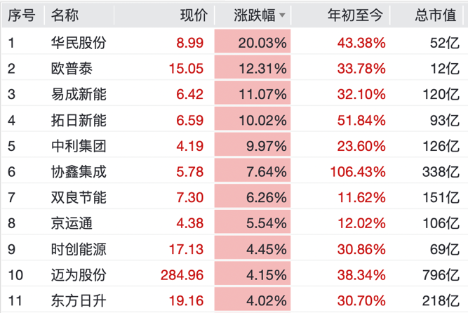 华民股份录得20cm涨停,正泰电源再度涨停,欧普泰涨超12%,易成新能涨超11%,协鑫集成涨超7%,双良节能、东方日升等涨幅靠前。