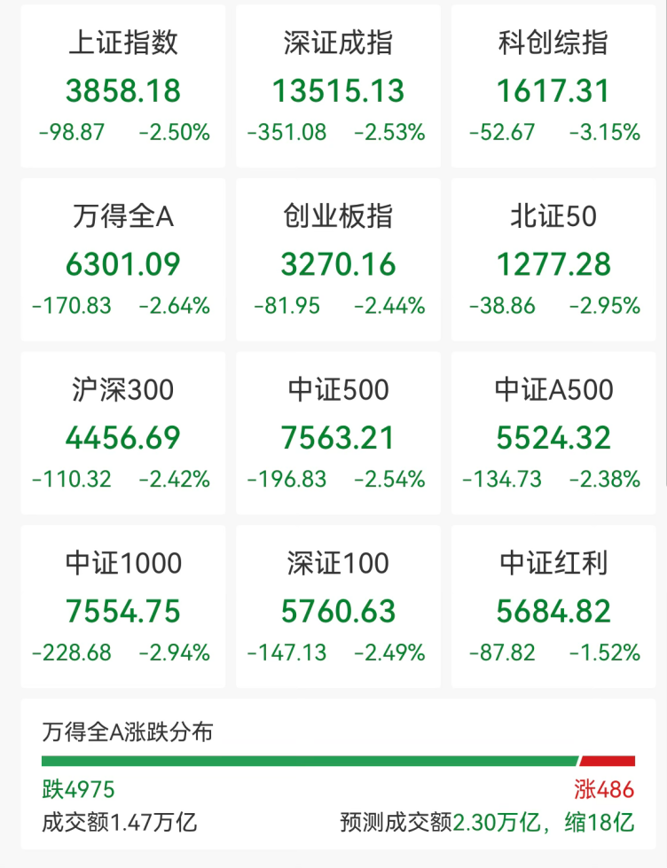 截至午间收盘,沪指跌2.5%,深证成指跌2.53%,创业板指跌2.44%,科创综指跌3.15%。