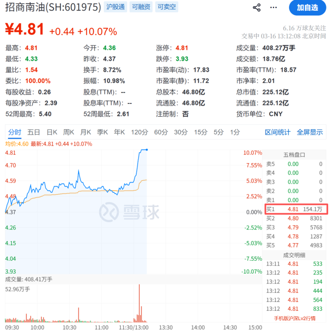 个股方面,招商南油午后直线拉升,报4.81元/股,封住涨停板。