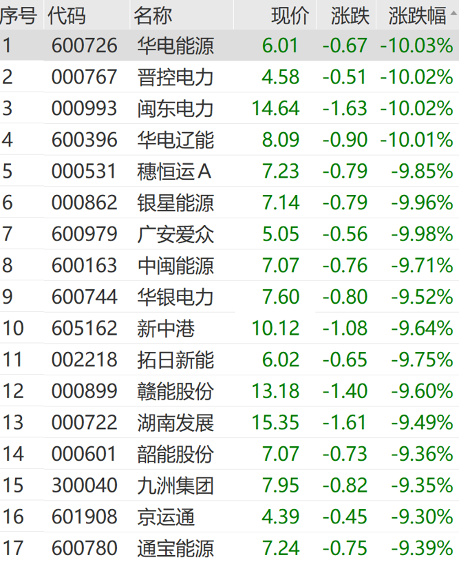 3月30日上午,部分资金撤离前期热门赛道,电力股集体跳水。华电能源、晋控电力、闽东电力、华电辽能等多股跌停,华银电力、赣能股份等跌超9%。