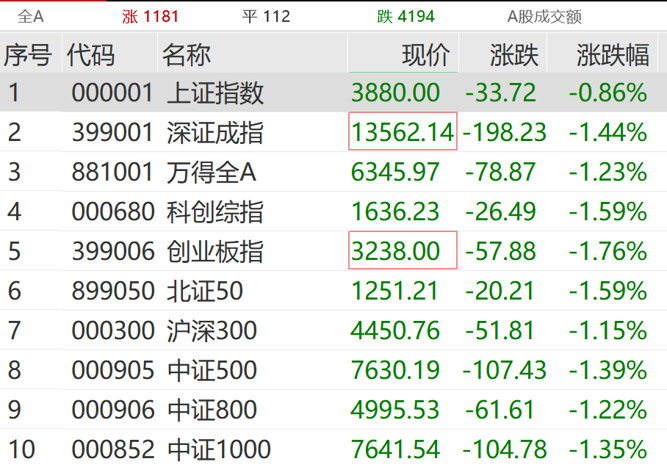 3月30日,A股早间小幅低开:上证指数跌0.75%,深证成指跌1.03%,创业板指跌1.26%。随后市场震荡走低,截至发稿,A股主要指数集体飘绿,近4200只个股下跌。