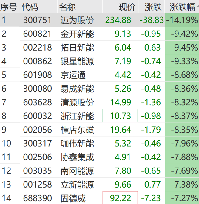 光伏板块大跌,迈为股份盘中跌超15%,拓日新能、银星能源、金开新能等跌超9%。