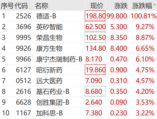 港股医药板块同步走强,德适-B首挂上市涨超100%,英矽智能涨超9%,荣昌生物、康方生物等大涨。