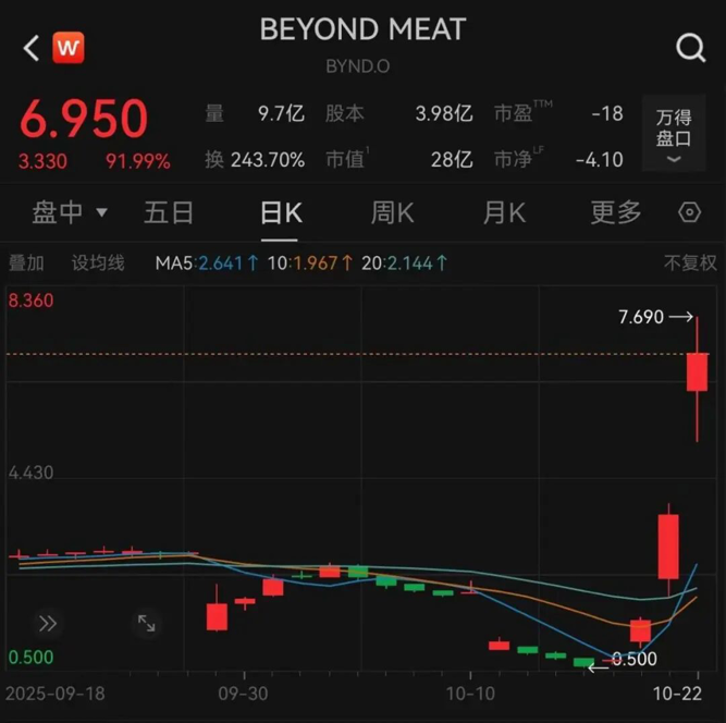 10月22日(周三),美股开盘,Beyond Meat触发熔断,截至发稿,涨超90%。