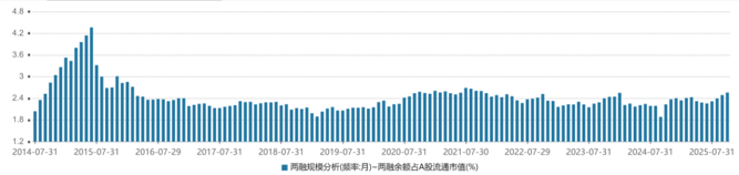 从两融余额来看,自8月以来,两融余额突破2.2万亿元之后,又接连跨过2.3万亿元、2.4万亿元的台阶。但是从两融余额占A股流通市值来看,仍然处于十年来的低位。