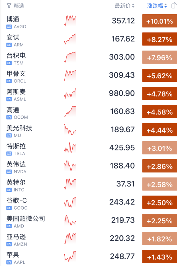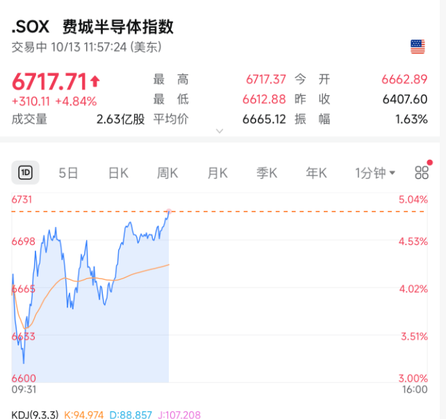 科技股集体暴涨,费城半导体指数涨近5%。