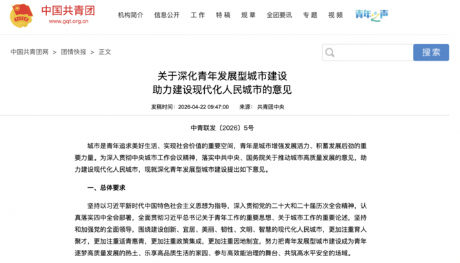 关于深化青年发展型城市建设助力建设现代化人民城市的意见中青联发〔2026〕5号