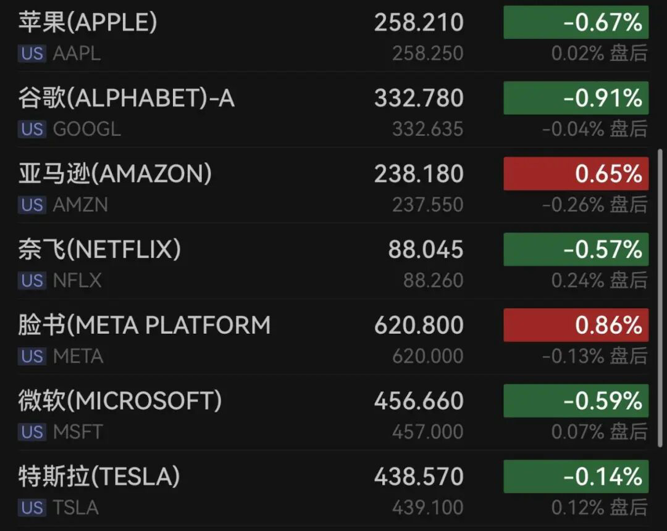 大型科技股涨跌互现,英伟达涨超2%,脸书涨0.86%,亚马逊涨0.65%,谷歌跌近1%,苹果跌0.67%,微软跌0.59%,特斯拉跌0.14%。